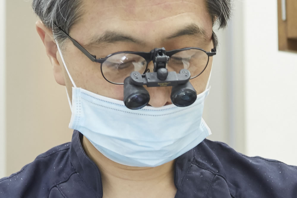 歯科治療は大変小さな対象に行いますので、肉眼だけに頼った治療には限界があります。そこで当院では拡大鏡を使用し視野を肉眼の数倍にまで拡大して精密に治療を行なうことで削り過ぎを防止しております。