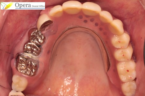 可能な限り入れ歯の面積を少なくするために、下顎は入れ歯ではなく保険のブリッジ(つなげた被せ物)にしました。