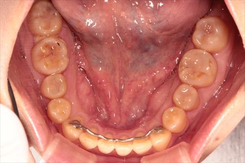 下の前歯は後戻りが最も起こりやすいので、ワイヤーで止めました。