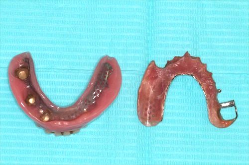 義歯を外したところです。歯に内冠と呼ばれるかぶせ物を装着し、その上に義歯をかぶせていきます。